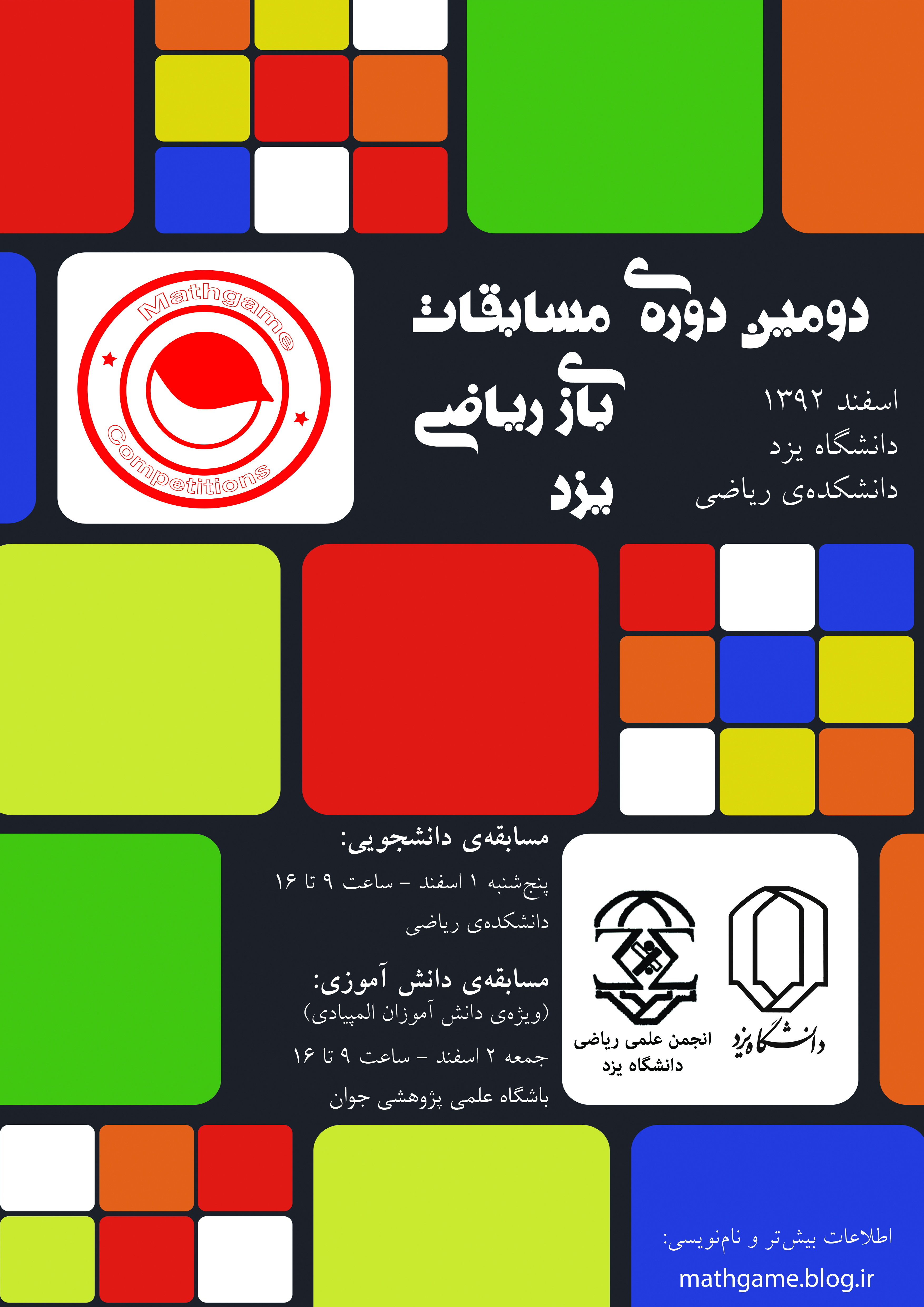 به اطلاع میرسانیم شرکت در بخش دانشجویی دومین دورهی مسابقهی بازیریاضی یزد برای دانشجویان همهی دانشگاهها و مؤسسات آموزش عالی کشور آزاد است اما متأسفانه امکان فراهم نمودن اسکان برای ما وجود ندارد.